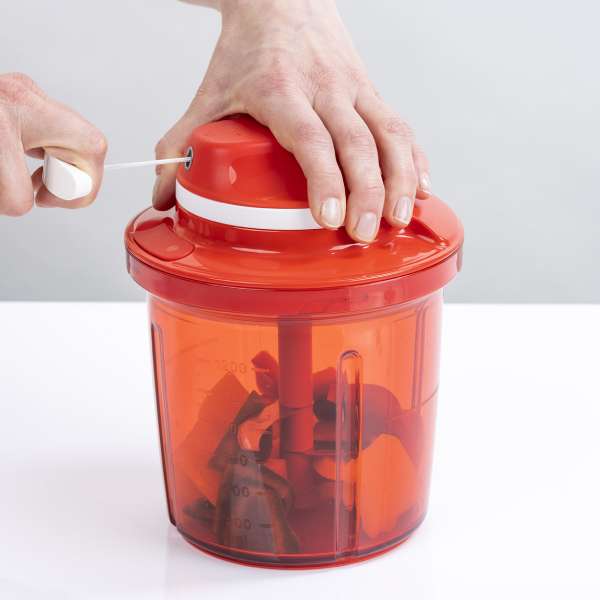 Brug den hvor som helst! Med denne manuelle foodprocessor skal du kun trække for at tænde for knivene - der er ikke brug for strøm.