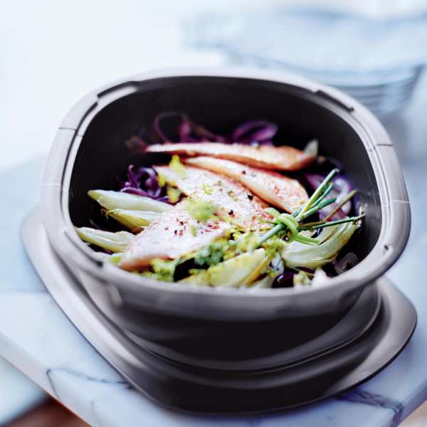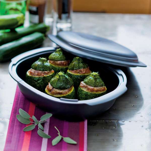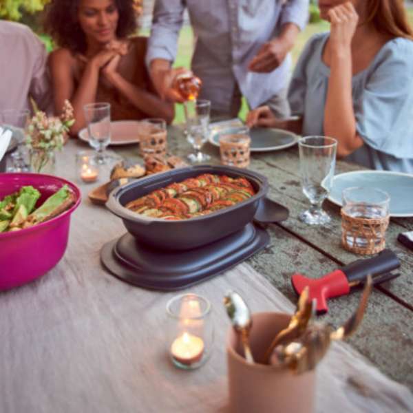 Med UltraPro kan hvem som helst bli en profesjonell kokk. Når damphåndteringen er optimal, tilberedes maten langsomt og med minimalt med fett. Ved å tilberede samtidig i mikrobølgeovn og stekeovn uten behov for dekantering eller forkoking, kan du spare energi og tid mens du bruner maten. Det er mange måter å kombinere UltraPro 3,5-litersgryten med det førsteklasses spesialserviset på. Den perfekte størrelsen for en familie på fire personer, inkludert kokelokket.